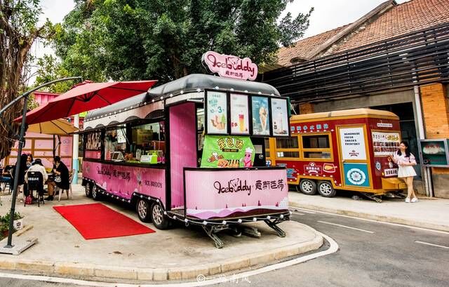 百益·上河城创意街区位于南宁市江南区亭洪路。街区里有一个非常特别的区域,设计成66号公路的样子,公路的路基上停着各种大巴、中巴和小巴。这些车辆被装修成房车的模样,不过却不是用来居住的,而是作为商店使用。