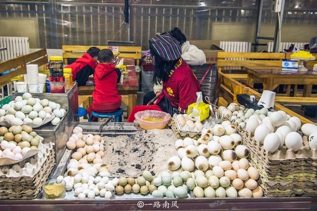 和田有两个夜市,一个是新夜市,一个是老夜市,两个夜市都在室内。新夜市的装修更加豪华,环境更好,中心表演舞台更加大气;老夜市是一条狭长的室内街道,更加接地气。这里最特别的景观是烤蛋摊档林立。烤蛋是的田的特色,除了烤鸡蛋,也烤鸭蛋、鹅蛋和鸵鸟蛋等等。以前只吃过煎蛋、卤蛋、煮蛋,第一次看到烤蛋,感觉很特别,很多游客啧啧称奇。