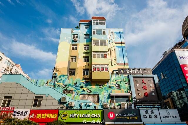 台东路步行街的建筑外墙不单被刷上不同的颜色,墙面上还有很多名师绘就的时尚风情画,这些风情画的内容包括摩登美丽的时代女性、田园风光和各种生活场景,非常接地气,很多外地游客都慕名前来参观,助推这条奇特的街道成为网红街。