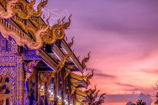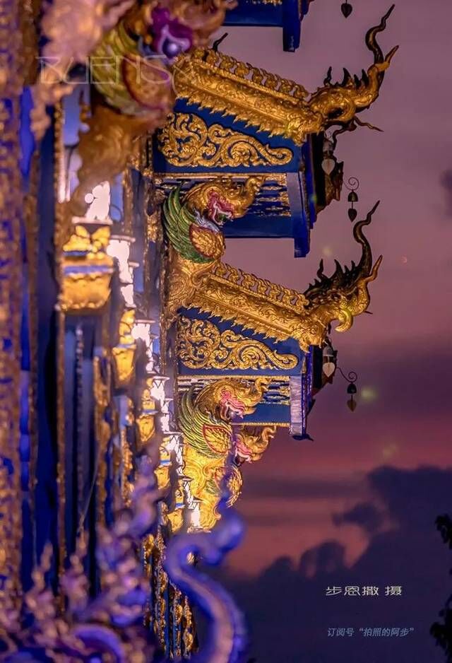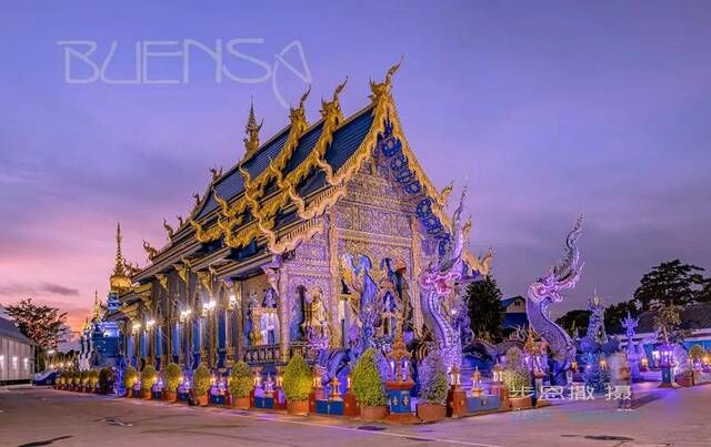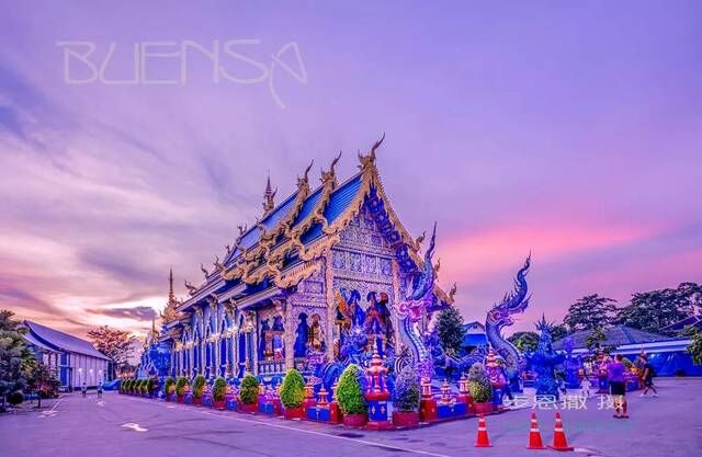 舍弃了在途中享受咖啡馆安逸时光的遗憾。匆匆的从清迈赶到清莱,总算是在太阳落山前赶到了这种小小的蓝色寺庙。 出发前研究攻略时发现,泰国清莱的蓝庙最美的时段就是映衬在落入余晖下的那一刻,所以卡准了时间在太阳落下的前一刻赶到了蓝庙。