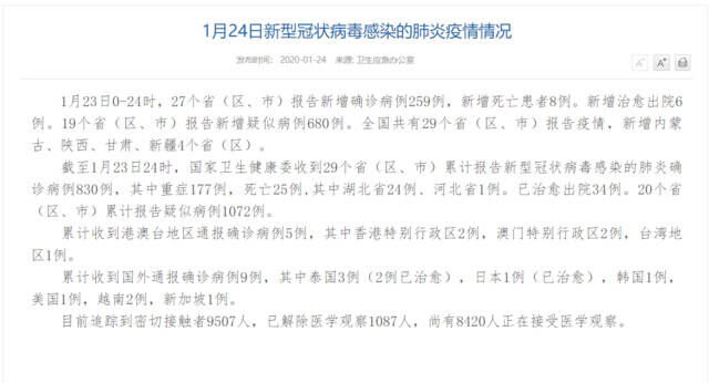 经济观察网讯据国家卫健委网站消息,1月23日0-24时,27个省(区、市)报告新增确诊病例259例,新增死亡患者8例。新增治愈出院6例。19个省(区、市)报告新增疑似病例680例。全国共有29个省(区、市)报告疫情,新增内蒙古、陕西、甘肃、新疆4个省(区)。