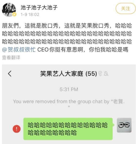 1月9日18点02分,池子晒出一张聊天记录截图,显示自己被移除公司群聊。