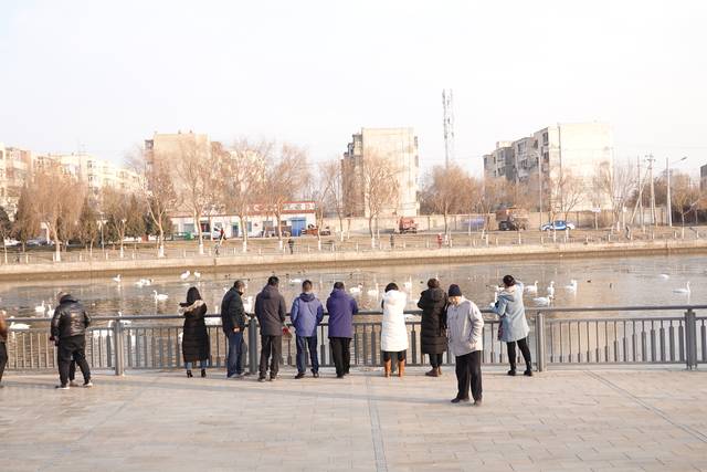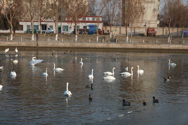 在市区的河面上一下子见到这么多天鹅,别说对于我这河北人很是罕见,就连当地人也觉得是难得一见的好风景。天鹅任意地在河中徜徉,有人悠闲的漫步,让这个寒冷的冬日多了几分暖意。