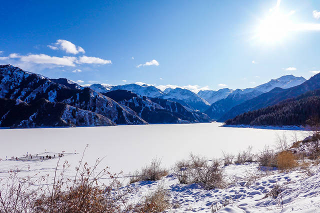 天山天池,是新疆独有的符号,爱新疆的人怎会错过它?天池坐落于北天山东段博格达峰下的半山腰,海拔1980米,是一个天然的高山湖泊,被誉为天山上的一颗“明珠”。这里四周环山,春季绿草如茵、夏季野花似锦,秋季绚丽多姿,冬季则静美如画。