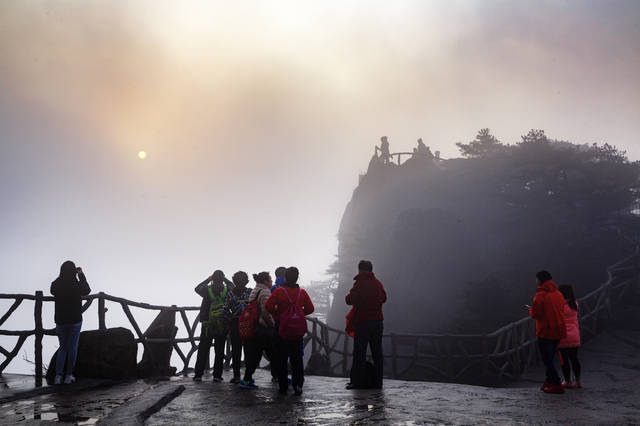 3月28日,雨后黄山的日出景观。当天早上6时许,一轮金色的朝阳从东方云天之间喷薄而出,金灿灿的朝晖染红了东方天际,高高的山峰被灿烂的云霞染成一片绯红,似一幅幅浓郁的水墨画醉倒游人。
