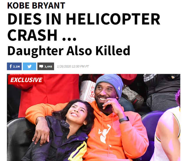 TMZ的消息显示,科比和她的女儿吉安娜乘坐直升飞机准备去参加一项篮球训练营的活动,但在飞行过程中,科比的私人飞机发生事故,尽管机组人员做出应急反应,但仍无济于事。现场的目击者声称他们在飞机坠落前听到了发动机爆发出巨大的响声。