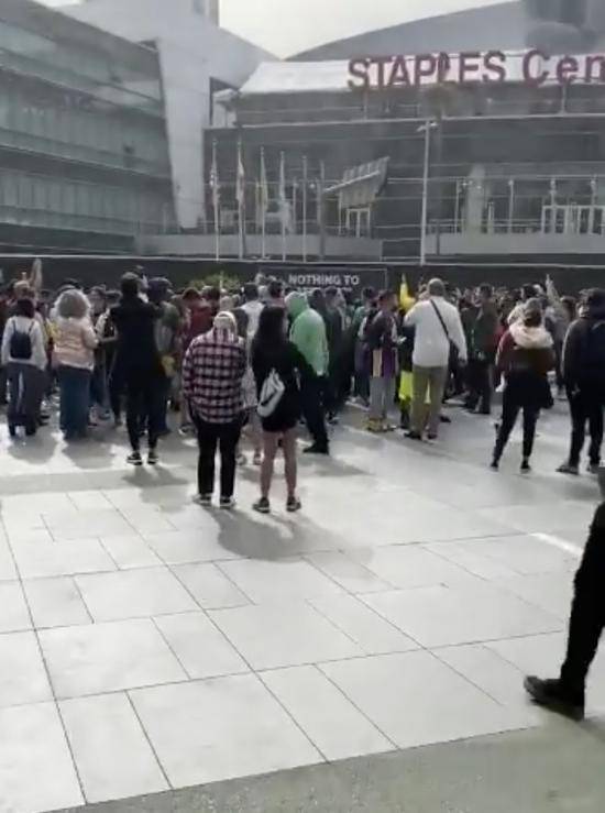斯台普斯中心场馆外今日本来有很多粉丝活动,格莱美颁奖典礼在此举办,但此时活动已经变成了科比的悼念集会。