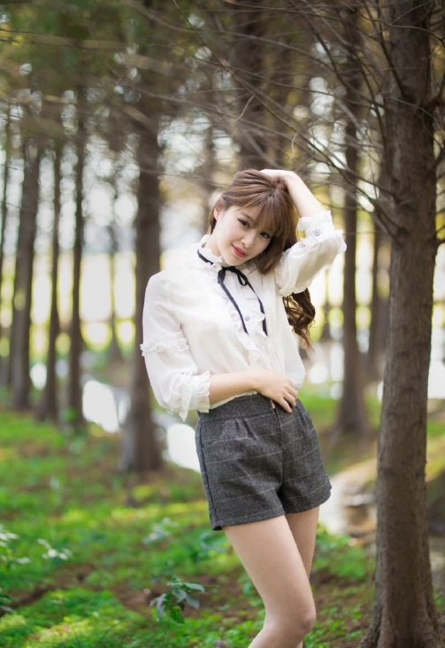 这位女生在她的下身搭配了一条深灰色的短裤。这条深灰色的短裤面料比较厚实,看这个样子应该是毛呢的吧。雪纺的材质搭配毛呢的裤子真的是很少见呢。不过这条短裤的款式还是挺好看的,认真地看还能看到一些细细的条纹。有裤子的款式算是中规中矩的,不算太紧绷,也不算太宽松。