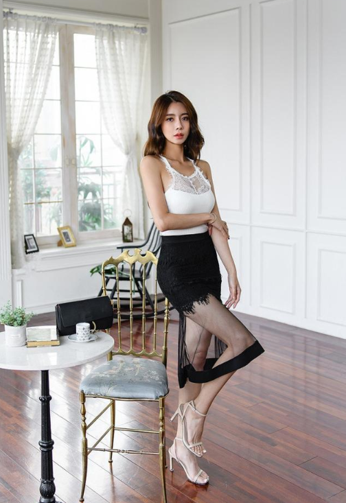 美女穿着一件蕾丝吊带,白色的蕾丝吊带颜色很纯净,白色也很显肤色。让美女的皮肤看上去吹弹可破,肤光胜雪。吊带的设计下露出的锁骨窝深浅适度,锁骨线条清晰平直,肩头饱满圆润但不臃肿。胸前的大片蕾丝更是让圆润挺拔的胸部若隐若现,线条浑圆饱满,十分诱惑。搭配着一条拼接网纱包臀裙,鱼尾的蕾丝设计与衣服上的蕾丝交相呼应,荷叶边的下摆设计更是增添了几分性感抚媚。包臀裙摆的提臀设计包裹着美女富有弹性的翘臀,更是展现了她绝美的气质。蕾丝吊带被塞进裙身中,束出了,美女纤细柔韧,不堪一握的腰身。
