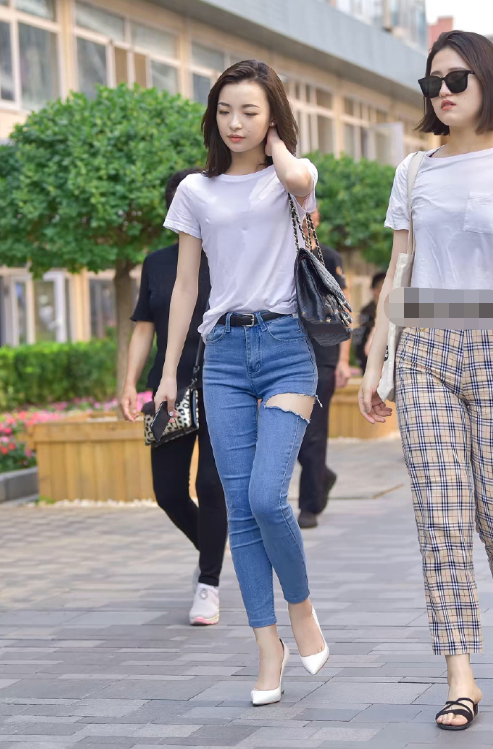 破洞的衣服在近年来都是比较热门的,这种奶奶看到想给补上,妈妈看到想扔掉的款式,能存活到现在也是因为本身比较受年轻人的喜爱,加上可以让设计更加性感,然后很多的小姐姐都喜欢穿这种破洞的设计了。上衣是一件比较简单的小白色短袖,这种风格的女孩子还是比较可爱清纯的,而且布料看上去也是比较舒服,给人一种高档的感觉,也是加上小姐姐本身就是比较白嫩的女孩子,这白色的短袖让小姐姐看起来更白嫩清纯了,虽是简单的颜色,却能够穿出不一样的气场和感觉,也是小姐姐的身材比较给力了