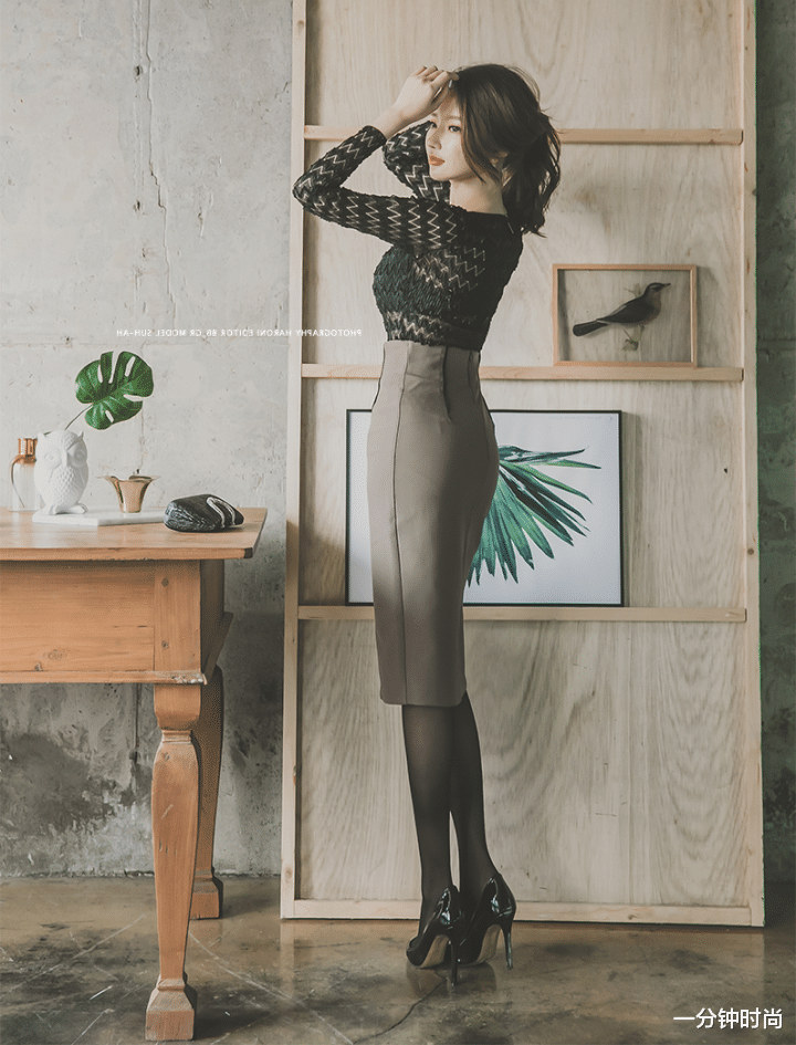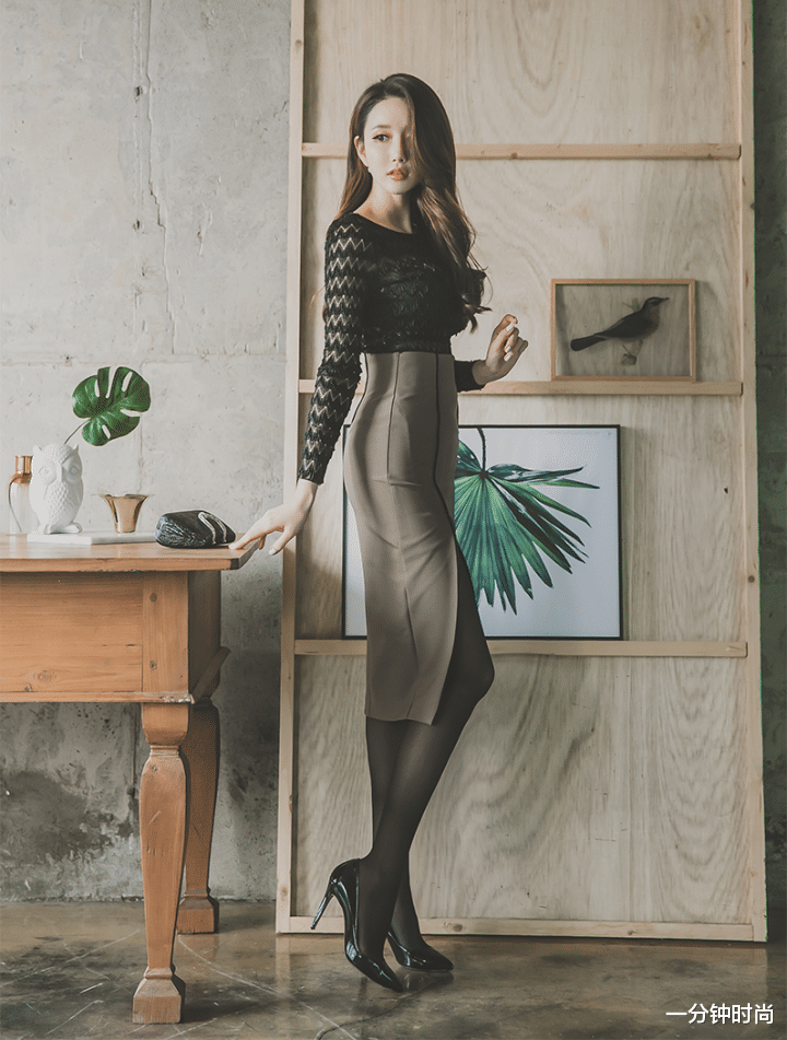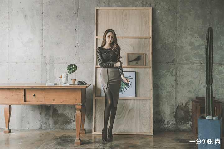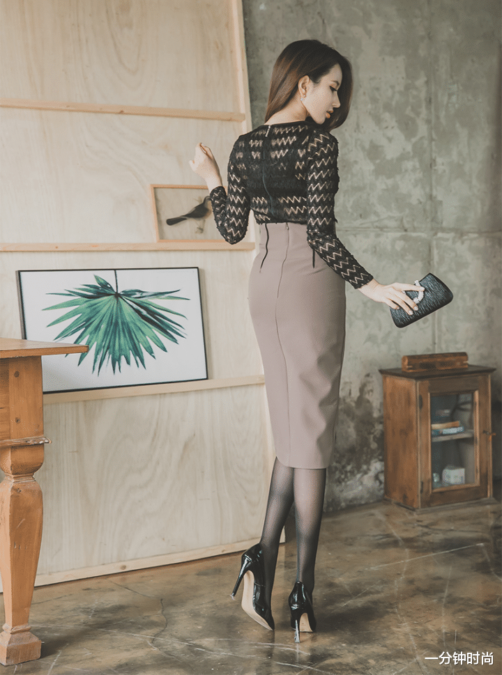 上半身的黑色长袖衫,看起来有一点类似于纺纱的朦胧魅力,波浪形的花纹也比较抢眼,很有独特的个性气质。而圆领和长袖的设计,也能在一定程度上给人一种比较含蓄的感觉,也是蛮不错的一种搭配。另外,修身的款式设计把长袖衫塞到了套裙下面,看上去也会显得更加高挑一些呢。