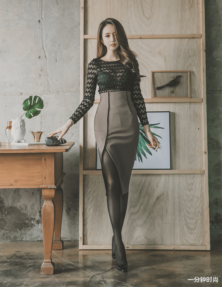 咖色的套裙采用的是长款的设计,这种长款的套裙看起来会比短款更加修长一些,更符合含蓄的东方女性的审美观。而前面的开叉设计,也能体现出一种比较精神的气质,如果把这个开叉放到侧面或者后面,可能看起来就会显得比较普通了一点。因此,这样的套裙才更符合个性的职业小资女性呢。