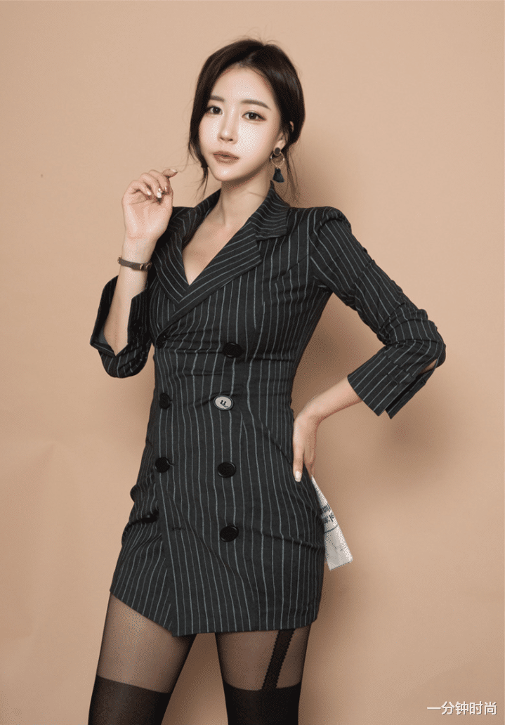就像这种把西装和连衣裙造型融合在一起的款式,看起来也是蛮有一番独特的气质。通过把西装的下摆加长,让它变成一个长款的设计,就能代替了连衣裙的作用。而且还添加了许多竖纹的花纹,营造出一点点休闲的感觉,以至于不会让整体氛围显得太过于那么严肃。这种融合连衣裙与休闲风格的西装款式,还是能给人一种比较时尚的感觉,同时也能保持西装的工整精神气质感呢。