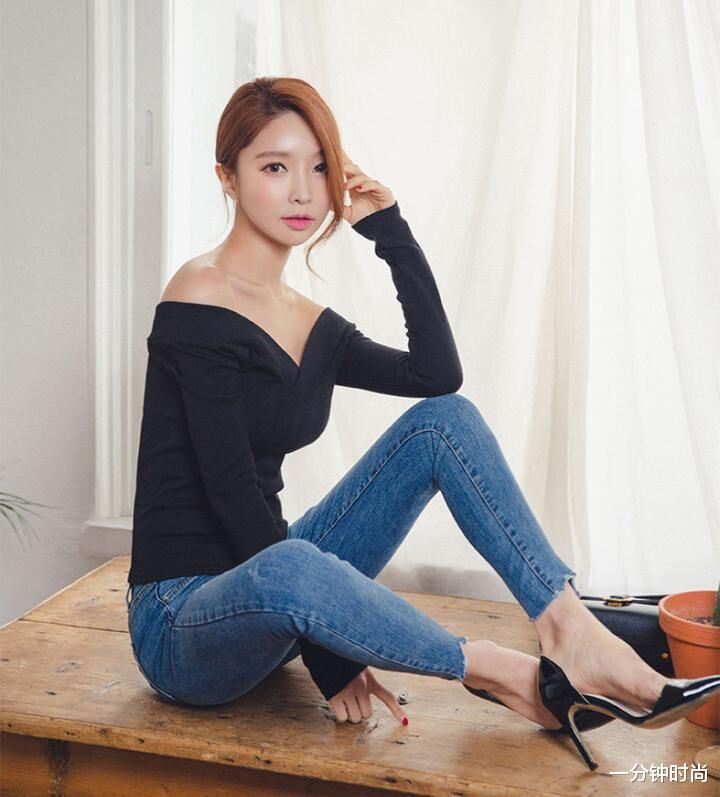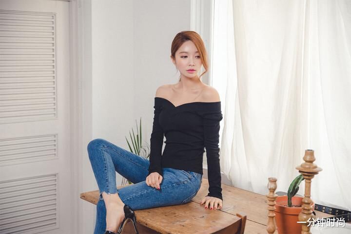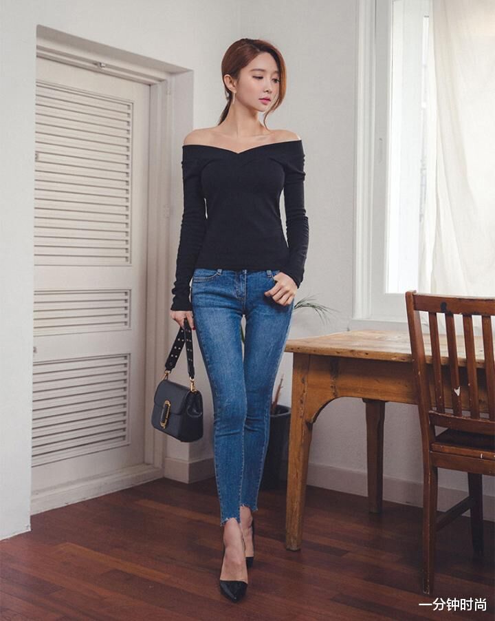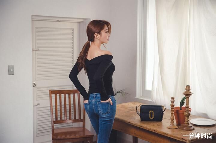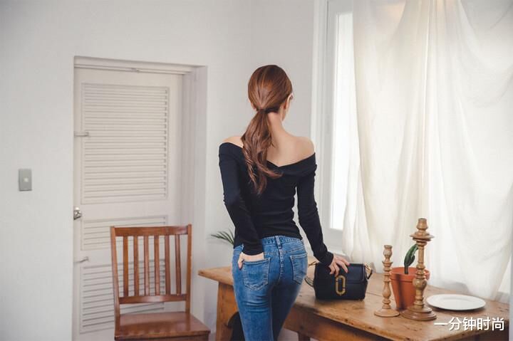 像这种蓝色牛仔裤搭配黑色长袖衫的造型,就是属于那种中规中矩的搭配方式。说不上有多么好看,也算不上有多么潮流,但是却也不会给人一种比较土气的感觉。黑色的长袖衫采用了一字平肩的领口设计,也能在一定程度上增加许多成熟的魅力,但是整体上的风格依然还是偏向于简约休闲的形象气质。