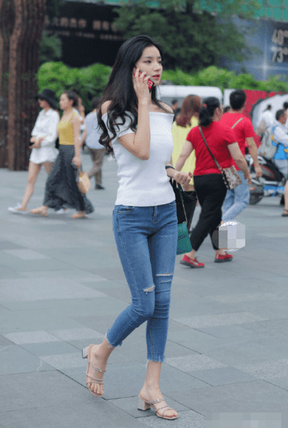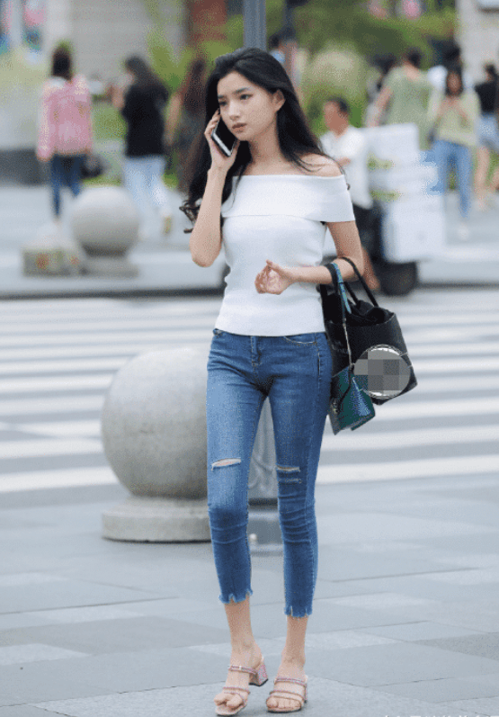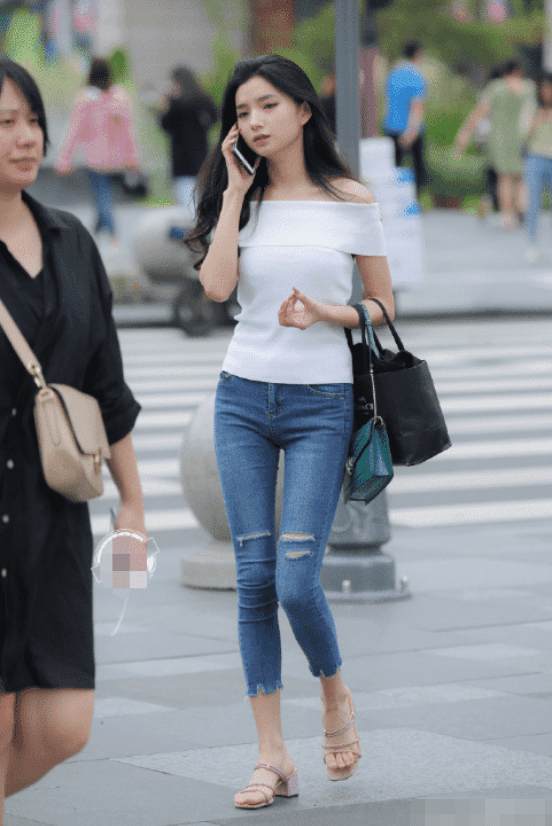 美女正在边走路边打电话,在人群中她的气质就非常吸引眼球,从整体看来美女的身材s型曲线十分明显,真是令人羡慕。黑色的长发大波浪披散在美女肩上,黑色的头发非常的凸显气质,卷发也很有成熟的味道。美女这一身穿搭也真是非常时尚了,白色紧身一字肩上衣搭配一条蓝色紧身牛仔裤,白色和蓝色的搭配非常的富有清纯活力气息,白色一字肩上衣很好的把美女白皙的皮肤和性感迷人的锁骨露在外面,特别的性感迷人。