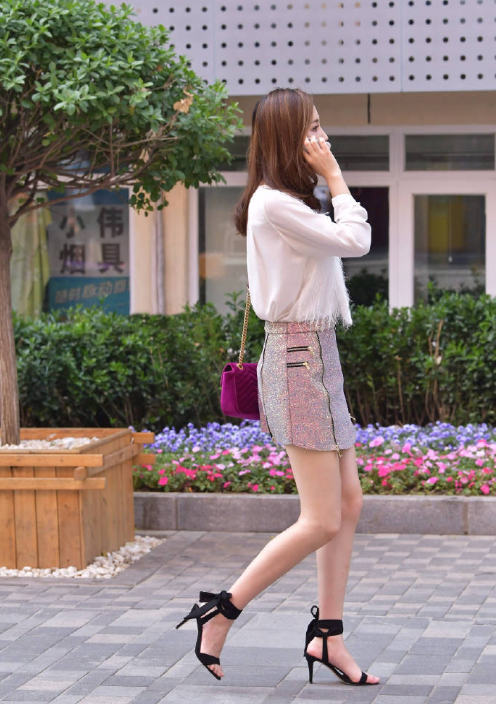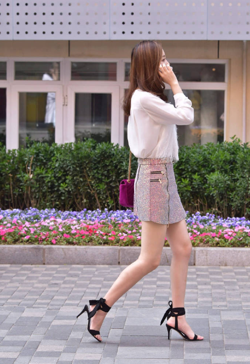 这一身穿搭非常的时尚,白色的上衣是很流行的款式,很好的把美女纤细的水蛇腰曲线勾勒出来,这件闪光的包臀裙非常流行,闪光的设计非常时尚,而且这件裙子把美女的腿部曲线完美的勾勒出来,她的一双大长腿又细又直,再加上这双高跟鞋的搭配,有一种时尚女人的独特气质。
