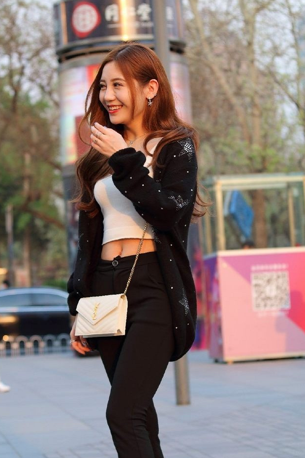 小姐姐上身穿了一件白色针织款的简单露脐装,下面搭配了一个黑色西装裤子,外面还加了一件黑色的针织开衫,这么简单的搭配穿在她的身上却带有一种非常不一样的感觉呢。