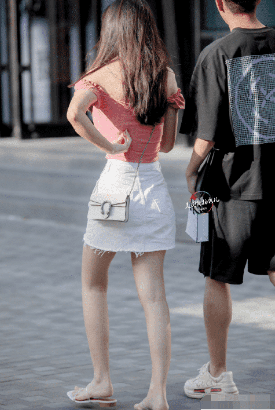 加上一条白色的短裙,布料是牛仔系列,垂坠感很强,也很有质感,看上去非常的高级。短裙下摆的碎边有着时尚品味,增加了几点休闲的感觉。这套衣服搭配高跟鞋一定会非常出彩,而这位女生穿着一双透明的凉鞋,看她高本来就非常合适,即便是平底的凉鞋也无所谓,站在她男朋友的旁边,最萌身高差的出现让女生看上去非常小鸟依人。