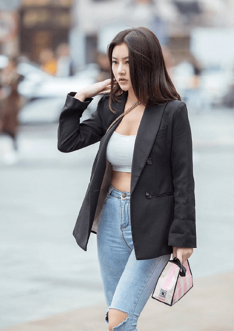 白色抹胸露脐装搭配一条破洞牛仔裤,而外面的黑色西装外套更是为她增添光彩。抹胸的设计下露出的锁骨窝深浅适度,锁骨线条清晰平直,肩头饱满圆润但不臃肿。也让我们看到了她长长的事业线,非常性感。露脐的设计下来露出的小腹平坦紧致,没有一丝赘肉。破洞牛仔长裤修饰着双腿的腿型,看上去更加修长笔直。露出了大片的肌肤,真是吹弹可破,肤光胜雪。里面的搭配既休闲又性感,而外面披着一件黑色的西装外套。颜色搭配挑不出一点错,黑色与白色搭配本就经典。美女身上的气质本身很强,穿着这件黑色西装外套看上去非常霸气。