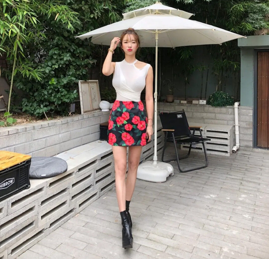 下身搭这样的印花短裙也非常好看,收腰修身版型凸显你的A4腰和S型曲线。红色印花精致热情,撞色元素下也显得清新有活力。