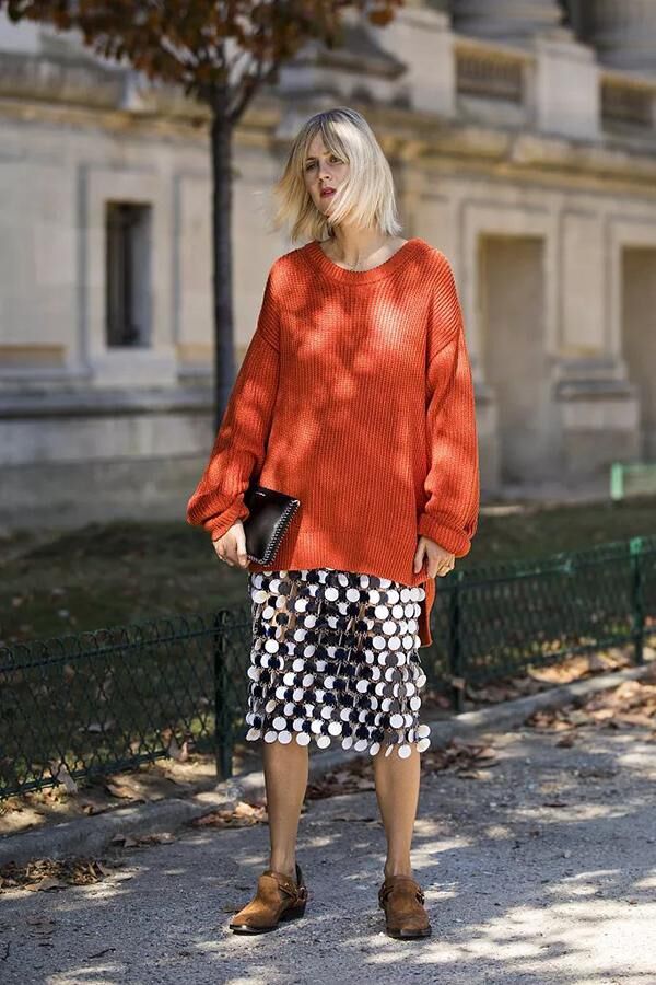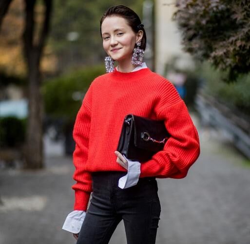 橙红色毛衣是亮眼吸睛的单品,即使是最简单的基础款也能让你的造型跳脱出平凡的感觉。如果选择oversized版型的橙红色毛衣,我建议你配上一条修身牛仔裤,上宽下窄的搭配会让你显得高挑纤瘦,但是小个子还是尽量挑选短款来穿,或者搭配高腰裤,把毛衣下摆塞入裤腰,轻松get大长腿。