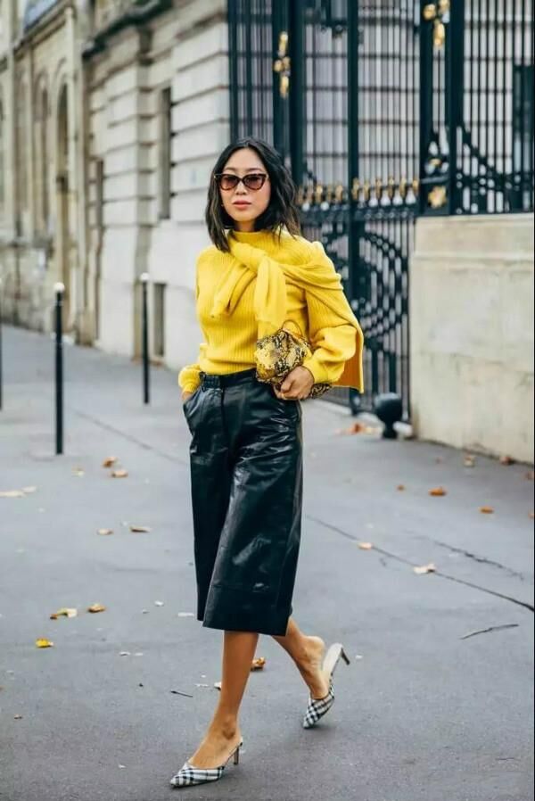 想把芒果黄毛衣穿得更高级又时髦,最简单的方法就是利用黄+黑的配色来组合,选择黑色裙装或者裤装来搭配,黑色能很好地压制黄色的轻浮感,更好地衬托出芒果黄毛衣的质感,让整体造型元气满满又不失稳重感。黄色带有一定的视觉膨胀效果,比较肉感的话,建议挑选宽松一点的款式。