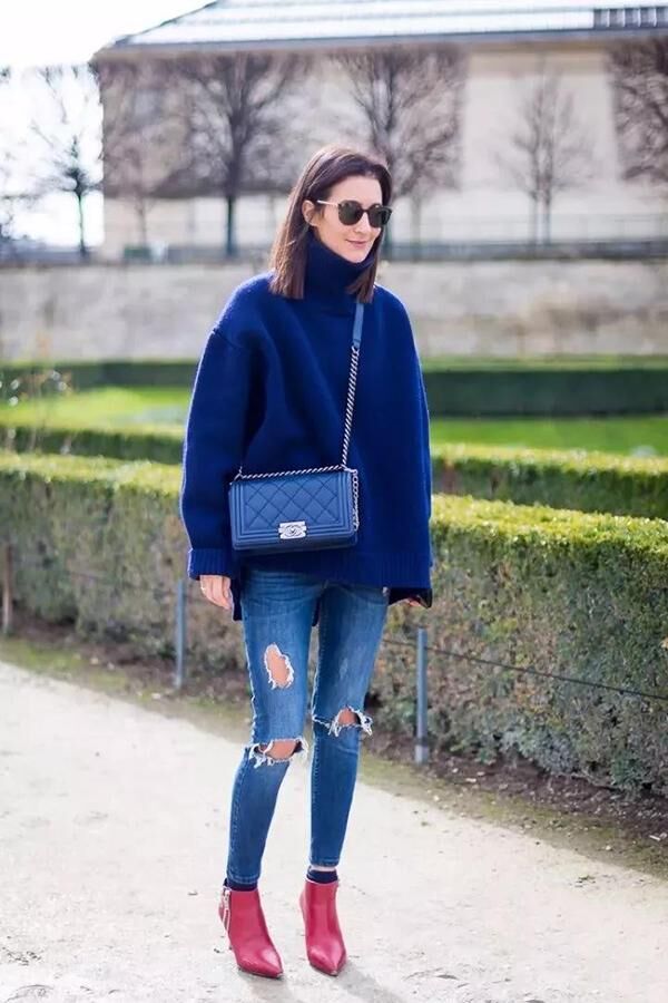 宝蓝色若是觉得以上两种颜色的毛衣还是太具挑战性的话,我推荐你试试宝蓝色。宝蓝色略带清冷的感觉,虽然跟到处红艳艳的春节没有多大关系,但是红色与蓝色作为经典配色,高雅迷人,在春节出游的时候穿上一件宝蓝色毛衣,到哪随便一拍都是高级感满满的大片。