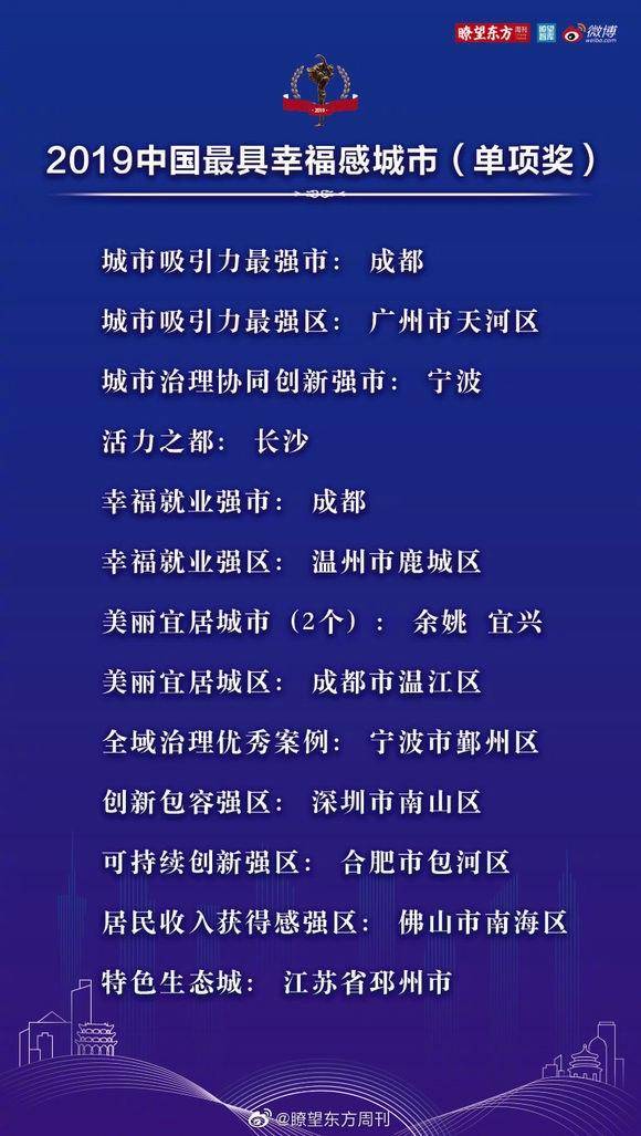 2019年11月25日,中国幸福论坛在广州举行,并向全国公布了“2019中国最具幸福感城市”的评选结果。其调查的指标包括了环境、公共服务、交通、安全、生活节奏、文化等16项主观调查,同时还包括了生活品质、城市向往、旅游向往等10项客调查。最后,成都、杭州、宁波、西安、广州、长沙、温州、台州、铜川、徐州这十个城市被推选为“2019中国最具幸福感城市”。成都荣获榜单首位,从2014年开始成都市已经连续六年位列榜单第一位了。