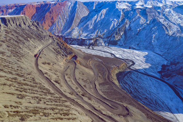 陡峭的崖壁和蜿蜒盘旋的公路,就像是蛟龙游弋在山中。从400多米高的峡谷地面向谷底望去,汽车与行人都变得如此渺小。崖壁上的一颗颗绿树,顽强得生长着,生动的点缀着陡峭的青山。