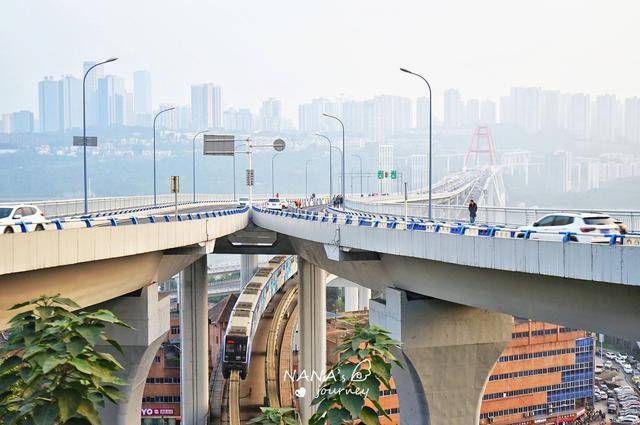 重庆 的立体层次感,在这样的大桥面前,能充分感受得到。桥面下通轻轨,而我们却还在山上,很神奇的感觉。