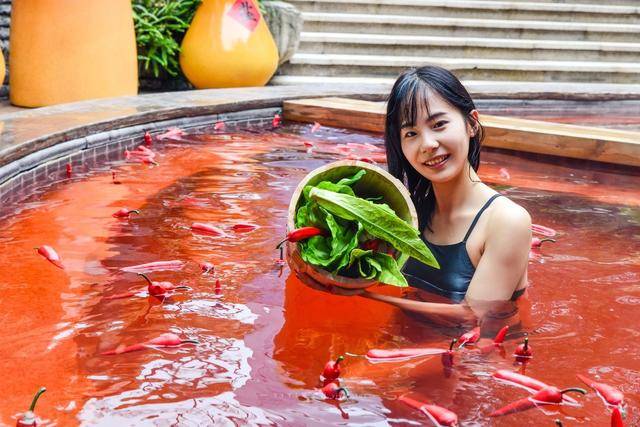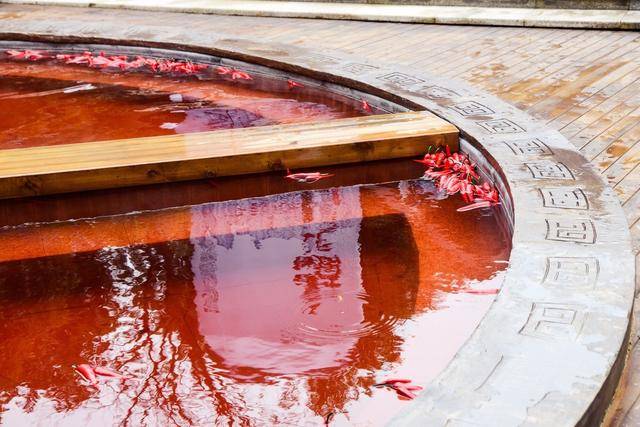 刚走进去就看到一个巨大的坑,里面倒满红色的汤,这个自然就是奇妙的红汤池。其实“汤底”是用鸡血藤、红花、首乌等中药药材熬制成红色,是不是像极了正在沸腾的巨型麻辣火锅。