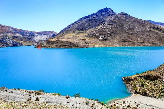 走过卡若拉冰川,车行大约半个小时,翻过一处山梁,路的左下方一泓长长的碧水就是满拉水库了。当然,也是免费参观的。