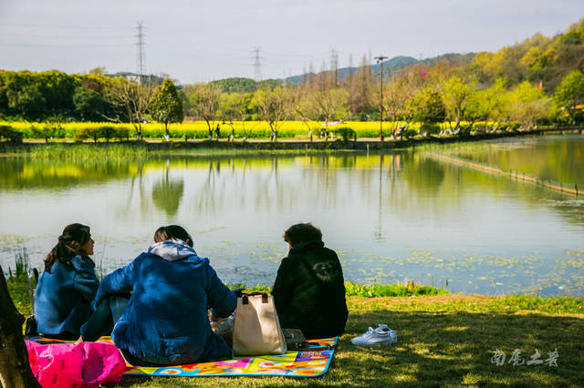 听说八卦田的油菜花开了,昨天一早赶到这里,疫情刚好转,游人还不多,都带着口罩。 微风拂面,大地复苏,湖岸边绿草青翠,静谧的水面浮萍隐现,桃花三两枝,摇曳着春天。 游人在岸边铺开营地野餐,眺望着对岸的油菜花。