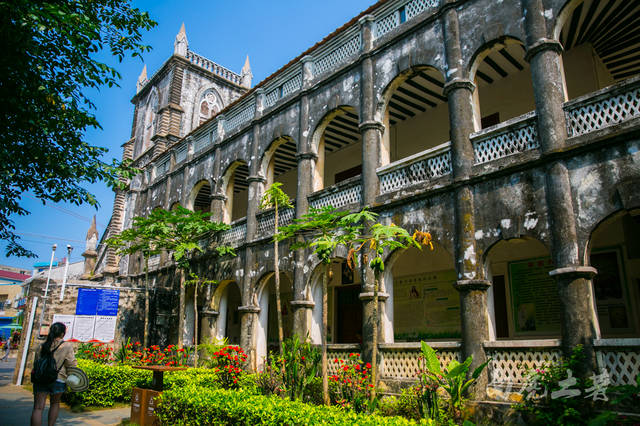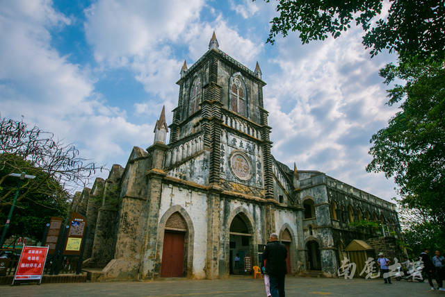 在向海的民宿看完日出,利用中午的时间,去转转涠洲岛三大必游景点之一盛塘天主教堂。租一辆电动车,迎着初春海岛拂面的清风,道路不宽,但还平坦,两侧绿荫夹道,大约20分钟。