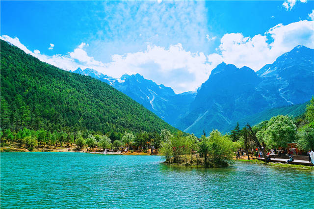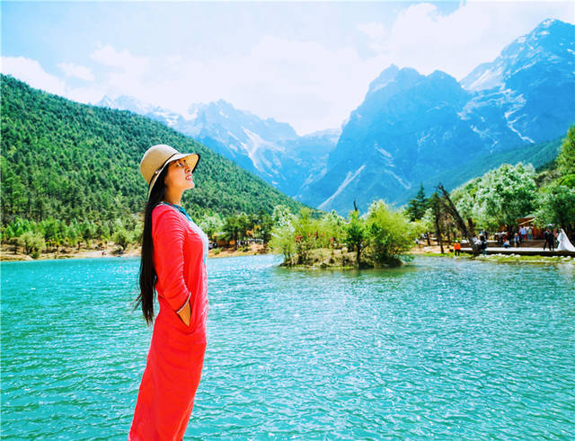 从玉龙雪山下来,很多游客都喜欢来蓝月谷走一走,微风轻拂过湖面,荡起层层涟漪,雪山、湖泊、绿树,眼前的画面色彩明快。