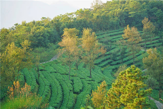 山水相依,茶田俨然,葱茏苍翠的绿色,在绵延起伏的山上铺陈,一直延伸向了天边。