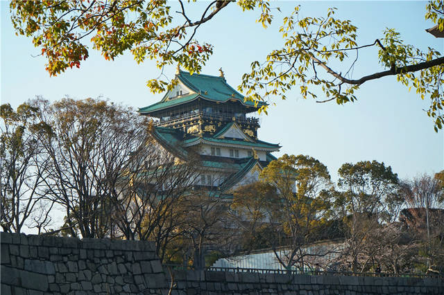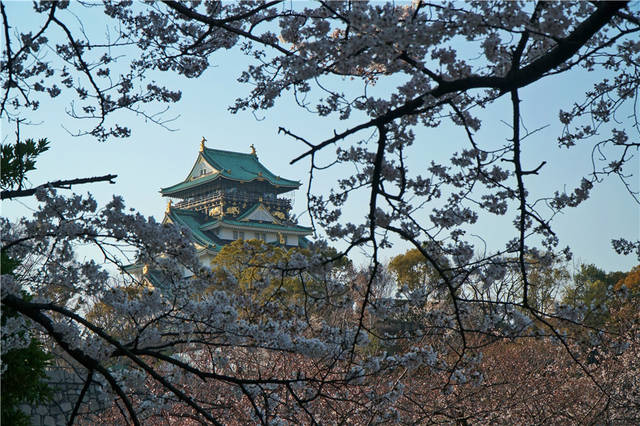 下图是大阪城,大阪的著名地标。大阪城公园包含两部分,一是建于600年前的大阪城,高墙深濠,雄伟的天守阁耸立;一是四周的公园,四月樱花盛放,景色尤其可人。古代日本的“城”不同于中国,它是军事堡垒,驻扎的是将军和他的军队,中国住的是官府与百姓。