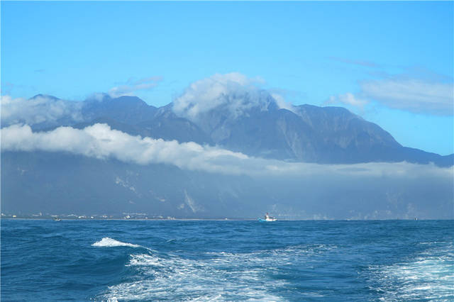 花莲最壮丽的海滩要数清水断崖、七星潭和石梯坪。我从海上拍摄花莲,它背倚中央山脉,只见碧水之上高山雄浑,高山之巅云岚环绕。