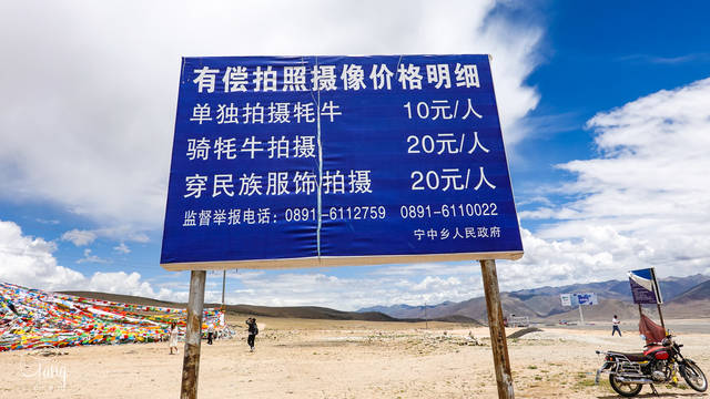 念青唐古拉山观景台,有偿拍摄写得十分清楚:单独拍摄牦牛10元每人,骑牦牛拍摄20元每人,穿民族服饰拍摄20元每人。虽然西藏几乎每个景点的拍照和各种动物合影都是有明码标价的,但是整理都有明示,当地人通情达理,也让人心里十分安定。