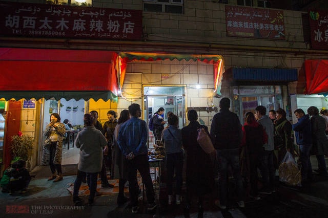新疆的夜的比国内其它地方都来得要晚一些,夜幕刚刚落下,位于阿克苏市中心人民广场的这家小店却已是灯火通明,热火朝天,小小的店面被围得水泄不通。