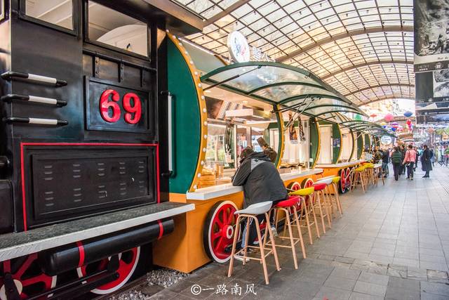 第一条叫南屏街巷,名气并不大,街上部分摊位连接在一起,外表装修成火车模样,游客亲切地称它们为“开在火车上的商店”,非常有创意。