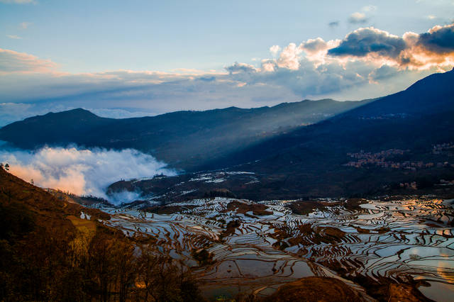 红河元阳梯田位于云南南部,是哈尼族人民世代农耕创造的奇迹。梯田一般都处在向阳的山坡上,阳光充足,雨水充沛。梯田蓄水期,阳光照射下,像一面面闪光的镜子。夏季禾苗生长期,绿油油,层层叠叠,像画家的调色盘。秋季收获季节,黄澄澄,金灿灿,像是天上的彩霞一样浪漫。