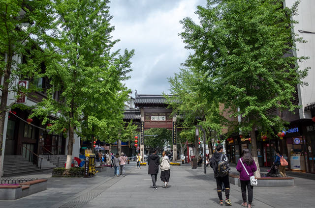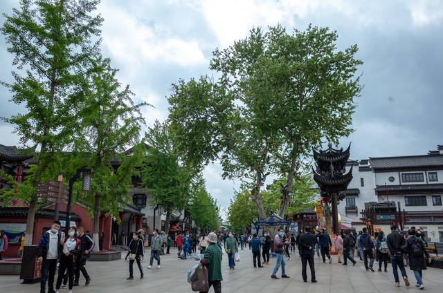 走到夫子庙景区内,虽然今天天气不好,但街道上已经有许多的游人前来游玩,春天的夫子庙,街道边的树木已是郁郁葱葱,游人穿梭其中,好不热闹。