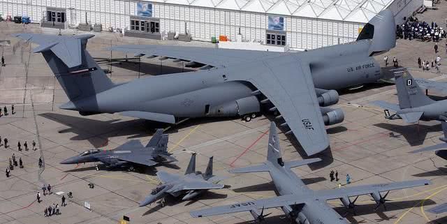 或许光说这些数字大家感觉不出实物有多大,图中的画面正是C-5“银河”运输机与F-15战机和C-130运输机摆放在一起的场景,这两款军机跟C-5放在一起显得异常“渺小”,地上的人则看起来跟蚂蚁一样。