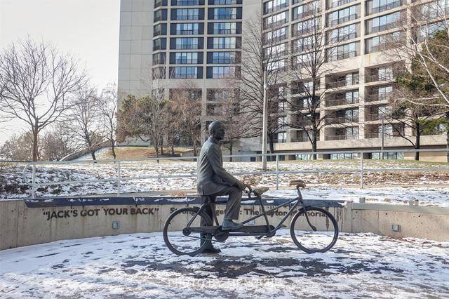 欣赏多伦多城市天际线最经典的视角,来自于安大略湖中的一连串小岛——多伦多岛(Toronto Islands),从安大略湖畔的Jack Layton Ferry Terminal码头乘坐轮渡约10分钟就可以到达。这个码头是以已故的前市议员Jack Layton命名的,旁边的公园里还有他骑着双人自行车的雕塑。通往湖心岛的轮渡有三条路线,往返于Centre Island、Ward's Island和Hanlan's Point,冬天时只有前往Ward's Island的轮渡,约半小时一班。