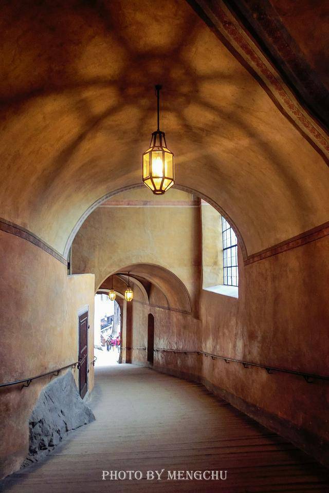 城堡地处小镇的制高点,有着优雅的拱形长廊,还有漂亮的彩绘墙体。在城堡的墙垛旁可以俯瞰小镇全貌,被伏尔塔瓦河环绕的CK小镇,高高矮矮密密仄仄的红色房顶,圣维塔教堂静静的伫立在河畔,惹眼的青色尖顶,随便哪个角度都如同明信片一样美。可惜今年的雪不够大,不然一定会更美。