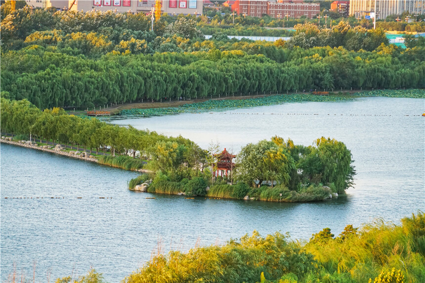 当夕阳的余晖把整个南湖晕染成色彩绚丽的绯红色,淡蓝色的南湖水也陶醉在了这样唯美的浪漫里,眼前的画面,宛若一幅北方清丽婉约的山水泼墨画,在我的面前缓缓铺陈开来。