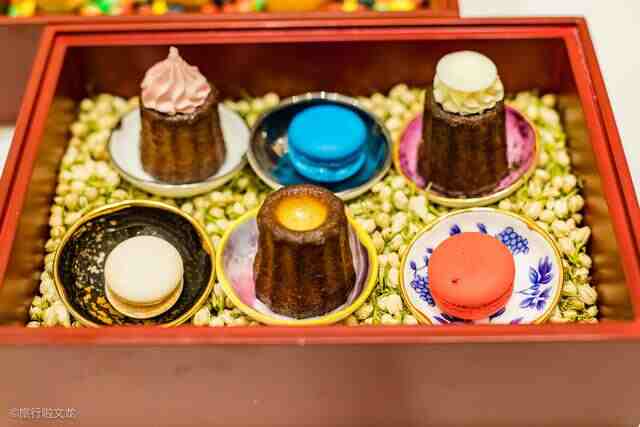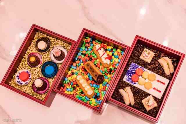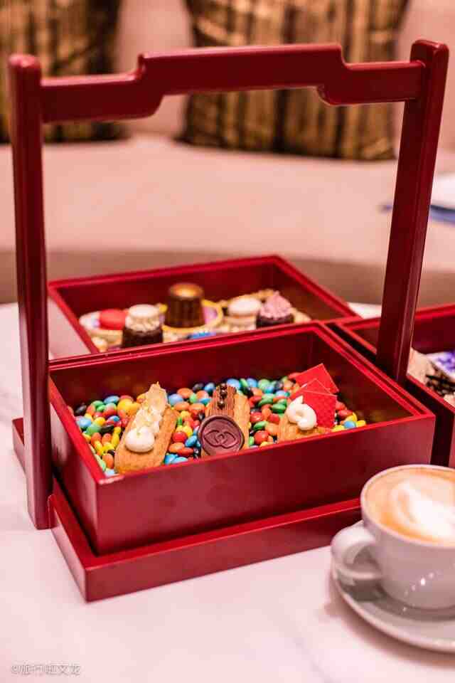 春节期间,在沈阳丽都索菲特酒店大堂吧一个安静角落,我带着女儿体验明星下午茶。有代表性的美味的甜品,颜值上更让人垂涎三尺。用三个朱砂红的木盒盛着,还有些中国风的感觉。一个盒子里有马卡龙,一个盒子里有小面包,还有一个盒子里有水果和三明治。