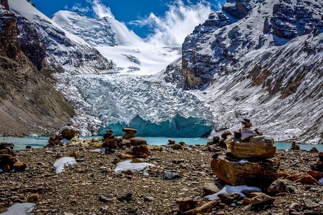 冰川脚下的湖边 冰川位于海拔5300米以上。没有直达的路。游客需要停车,冒着高原反应的风险走一条土路,然后才能走到冰川脚下的湖边。靠近边境,人烟稀少。如果没有熟悉这条路线的导游,一个人走是很危险的。58号冰川因为外界很少注意,交通特别不方便,所以比同地域干净很多。冰川位于两个峡谷之间,有点像阿根廷的微型佩里托 莫雷诺冰川 。当人们登上袖手旁观湖,顺着冰川看向远处的雪山时,他们有一种错觉,以为只要穿过它就能到达彼岸。