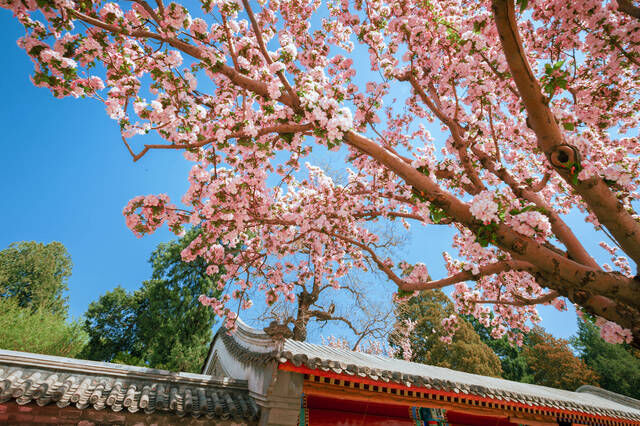 其实北海公园的历史比600年故宫还要久远,这里在辽金北宋时期就已成为皇家游山玩水的园林,至今已有千年。北海公园里栽种的各种花木也非常众多,前一阵是山桃,而最近海棠花则开得正艳,红色的花朵开满枝头,如粉色的祥云一般。